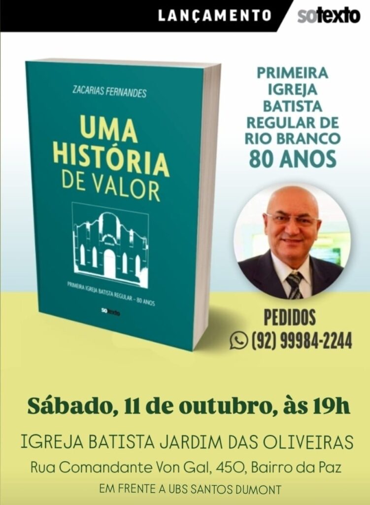 No próximo dia 11 de outubro, sábado, às 19h, o maestro e escritor, Zacarias Fernandes lançará sua obra literária “Uma História de Valor – Primeira Igreja Batista Regular – 80 anos”. O evento ocorrerá na Igreja Batista Jardim das Oliveiras, localizada R. Cmte. Noberto Von Gal, 450 (Hileia), bairro Da Paz, zona Centro-Oeste.