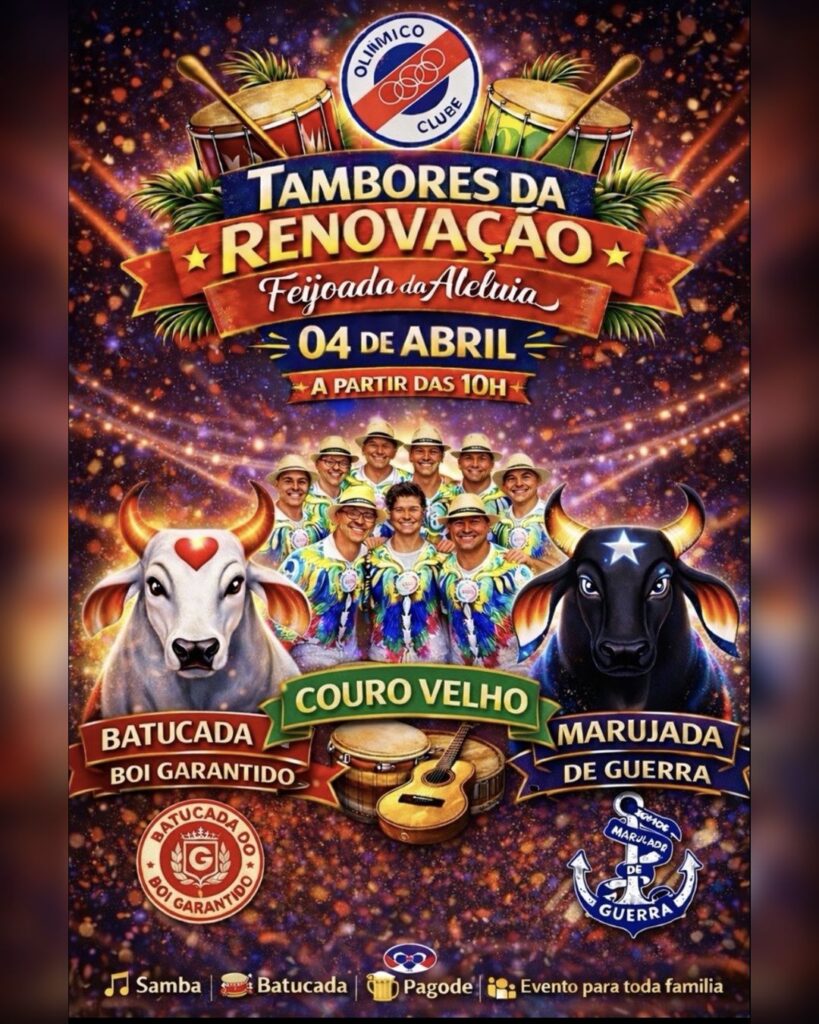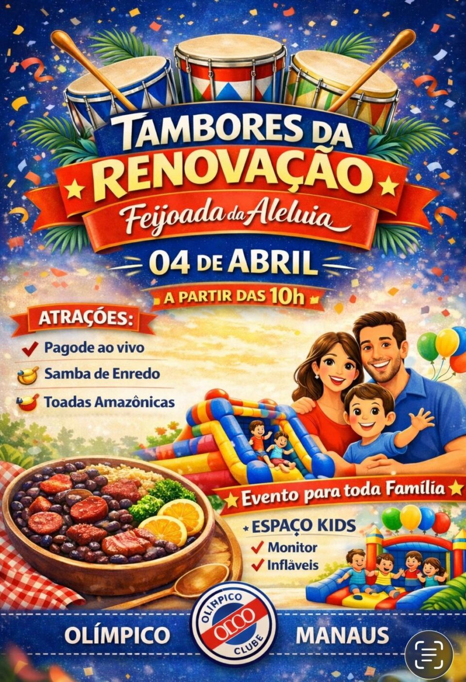 O Olímpico Clube promove no próximo 04 de abril o evento “Tambores da Renovação – Feijoada da Aleluia”, reunindo música, gastronomia e programação familiar no Parque Aquático da instituição, em Manaus.