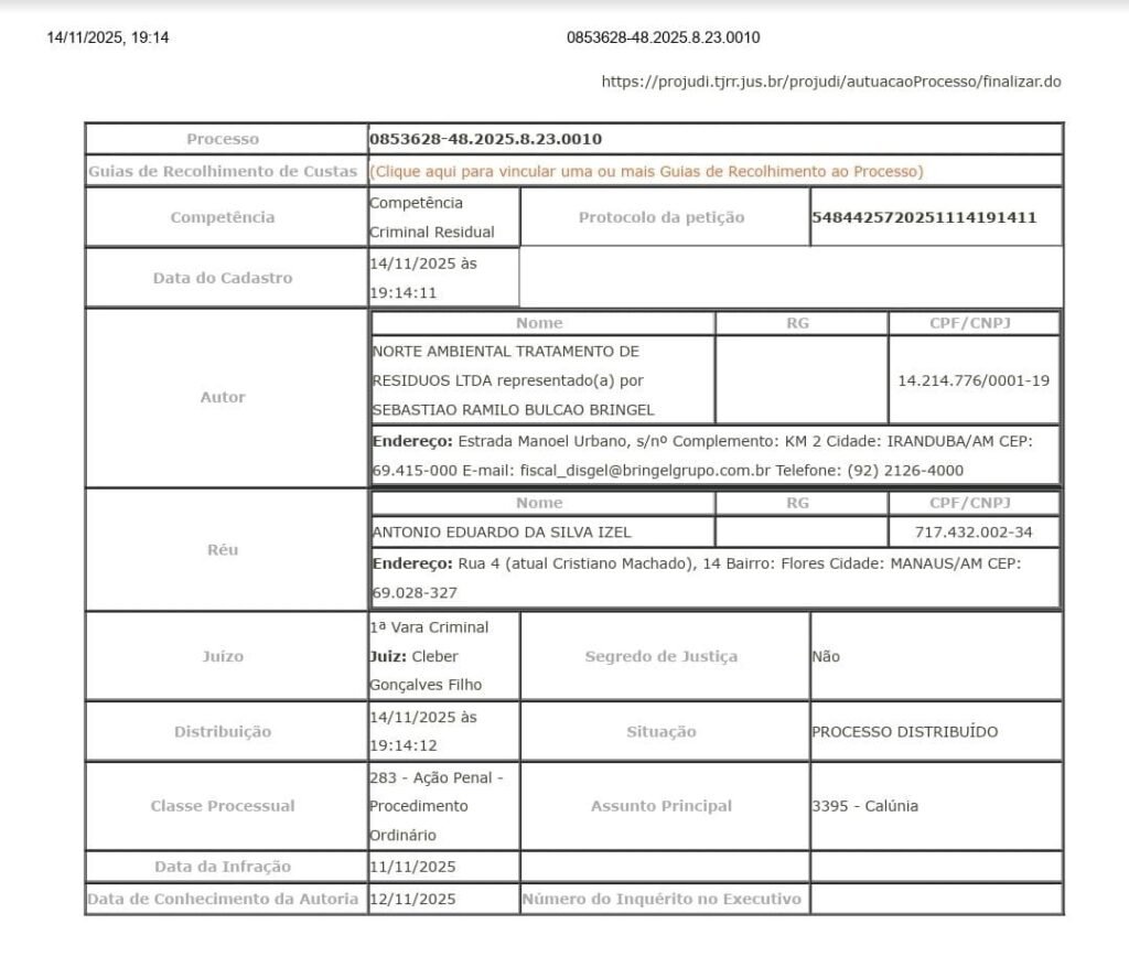 De acordo com os autos do processo nº 0853628-48.2025.8.23.0010, disponibilizados no sistema judiciário, a empresa figura como autora e Antonio Izel como réu. O documento indica que a petição foi protocolada no dia 14 de novembro de 2025 e a infração apontada foi datada em 11/11/2025, com ciência da autoridade no dia 12/11/2025.